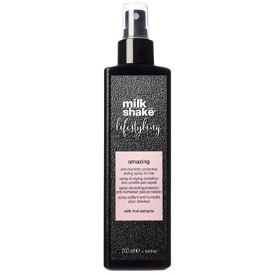 milk_shake lifestyling amazing anti-humidity protective styling spray gives structure with heat, creating a waterproof film that covers the hair completely, sealing the cuticle. This protective layer stops humidity from penetrating into the hair fiber whilst protecting hair from the stress of heated tools and stopping hair color from fading, keeping hair color fresh and radiant. It also reduces drying time and increases the hair's manageability.